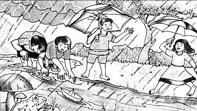 14. A4 कागज पर भू-दृश्य चित्रण के अन्तर्गत भू-दृश्य के सभी घटकों को ध्यान में रखते हुए वर्षा ऋतू का चित्रण करके उसे रंगों से सजाओ।