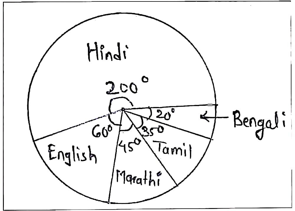 19. एक छात्रावास में विभिन्न भाषाएँ बोलने वाले छात्रों की संख्या नीचे दी गई है। आँकड़ों को पाई चार्ट में प्रदर्शित करें।