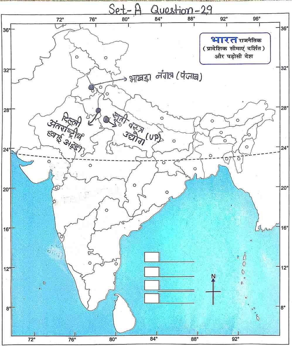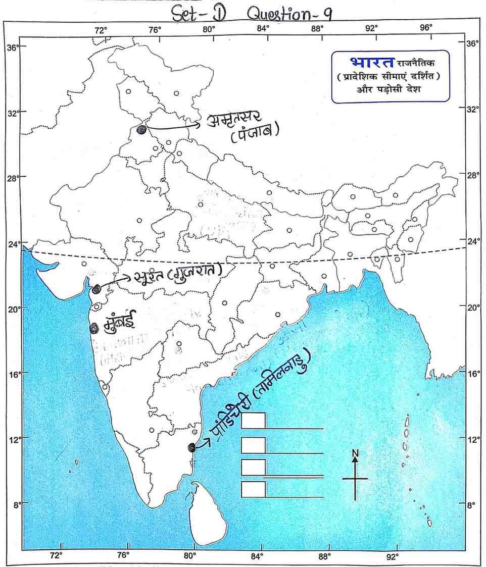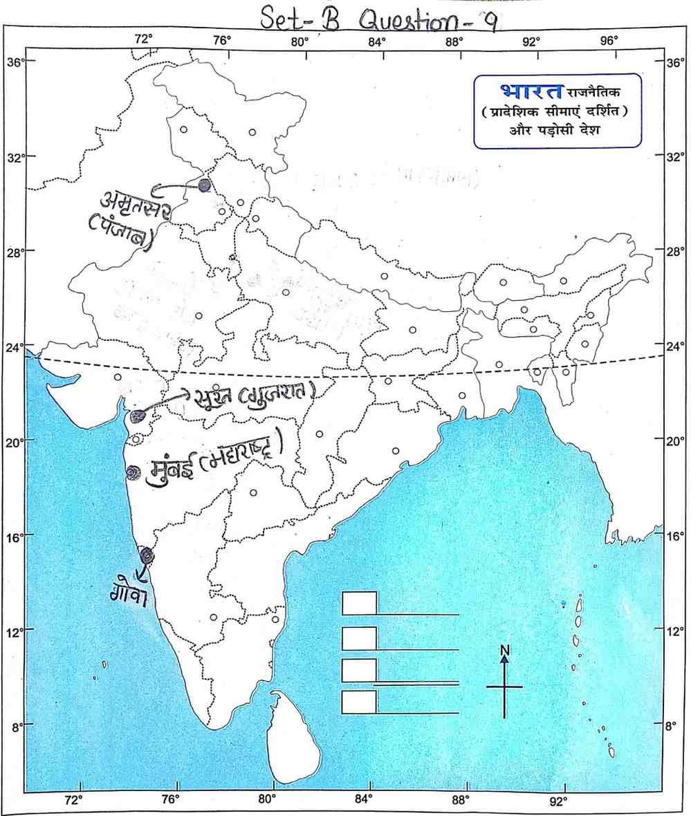 Q9. दिए गए भारत के रेखा मानचित्र पर निम्नलिखित स्थानों को दर्शाइए :