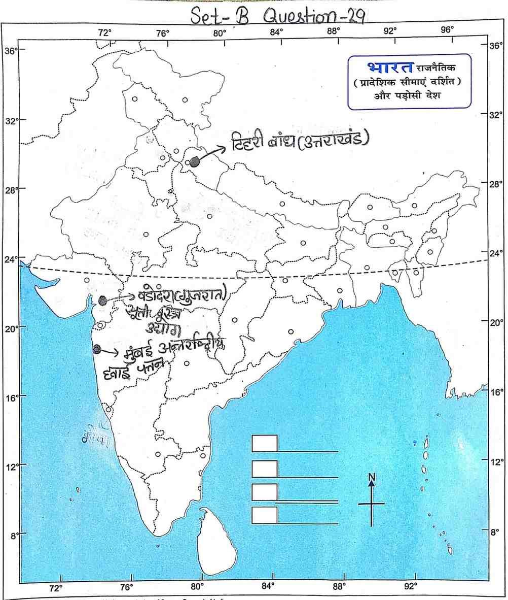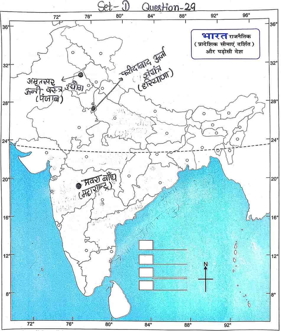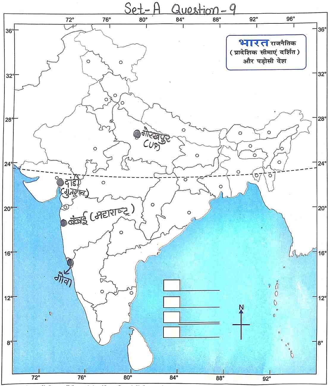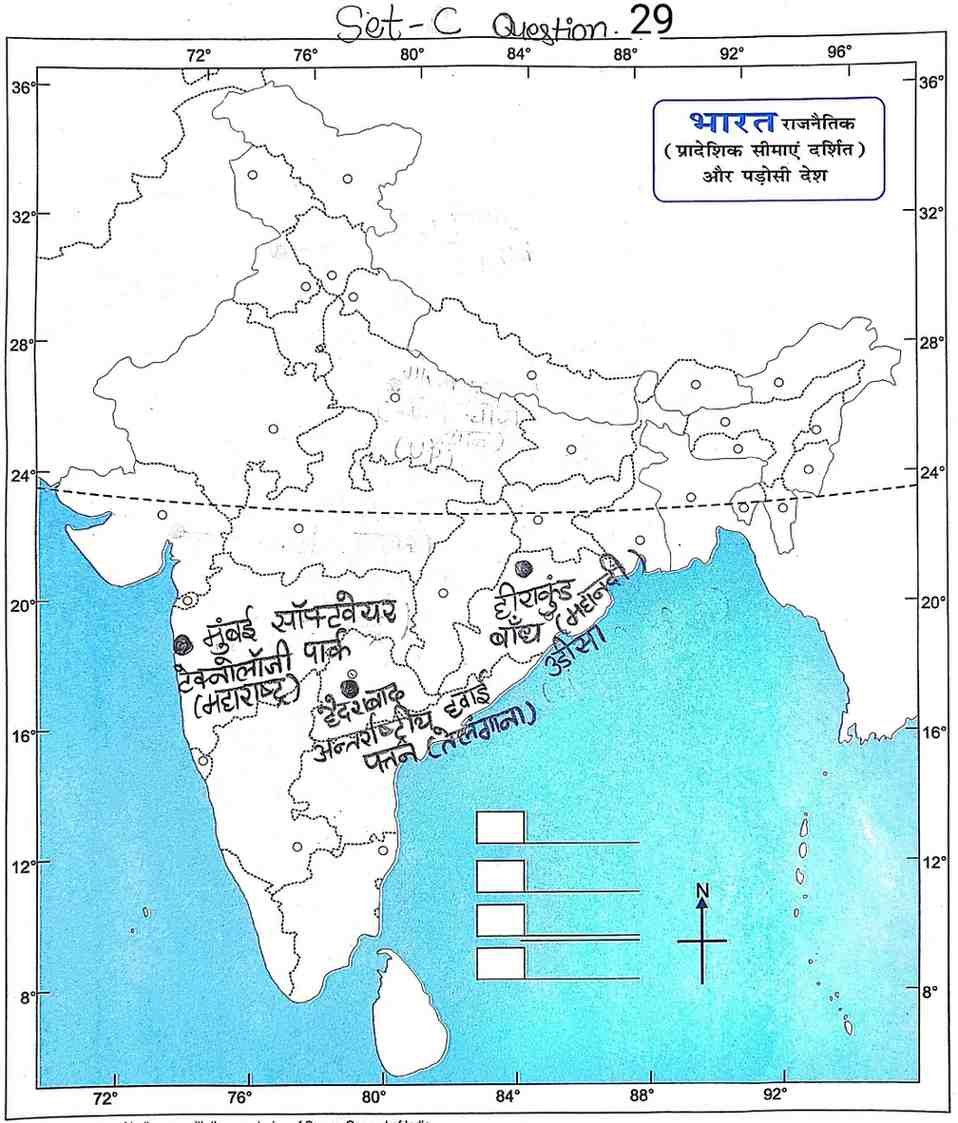 Q9. दिए गए भारत के रेखा मानचित्र पर निम्नलिखित स्थानों को दर्शाइए :