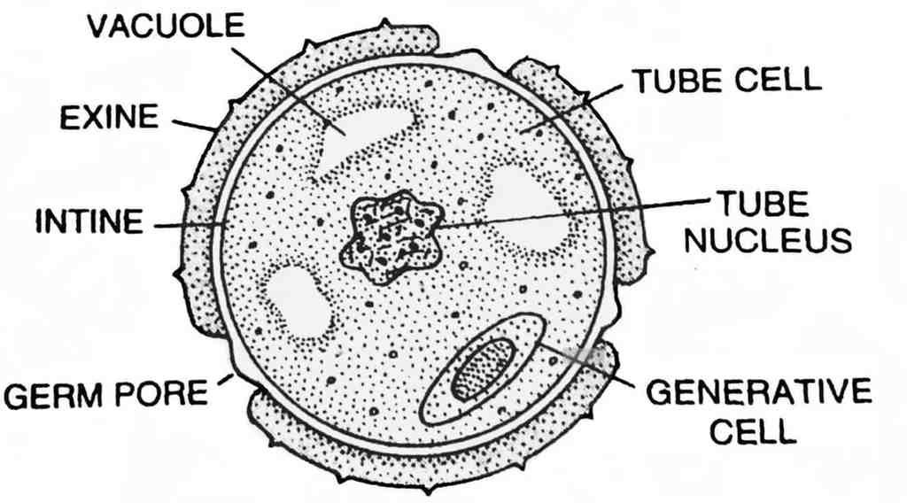 Pollen grain is the male gametophyte of flowering plants. It is generally spherical in shape and very small, about 25–50 µm in diameter. It is surrounded by a two-layered wall. The outer layer (exine) is made of sporopollenin, a highly resistant substance that protects the pollen. Exine has germ pores through which the pollen tube emerges. The inner layer (intine) is thin, made of cellulose and pectin, and helps in the formation of the pollen tube. Inside the pollen grain, there are usually two cells. The vegetative cell is large with abundant cytoplasm and a nucleus, and it forms the pollen tube. The generative cell is small and divides to form two male gametes. Pollen grains may be shed in a 2-celled stage (most plants) or a 3-celled stage (some cereals). Their viability differs among species – short-lived in rice and wheat, but longer in legumes and some other plants.