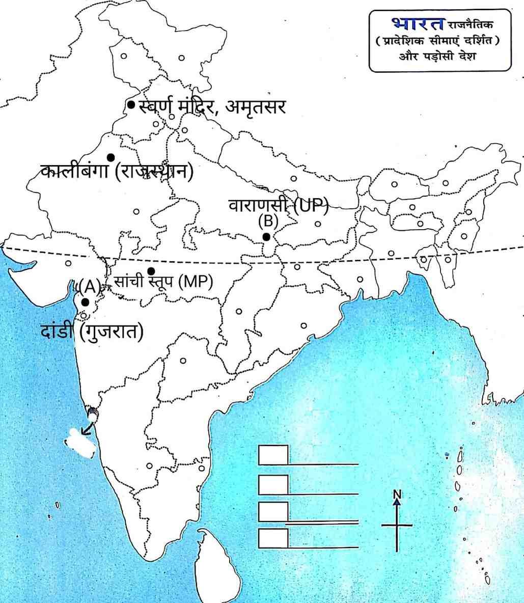 भारत के मानचित्र में दो स्थल हैं जो (A) और (B) के रूप में चिन्हित किए गए हैं पहचान कर इनके नाम लिखिए। इनमें से एक स्थल गांधी जी के आन्दोलन से सम्बन्धित है और दूसरा स्थल जहाँ पर फरवरी, 1916 में हिंदू विश्वविद्यालय का उद्घाटन समारोह हुआ।